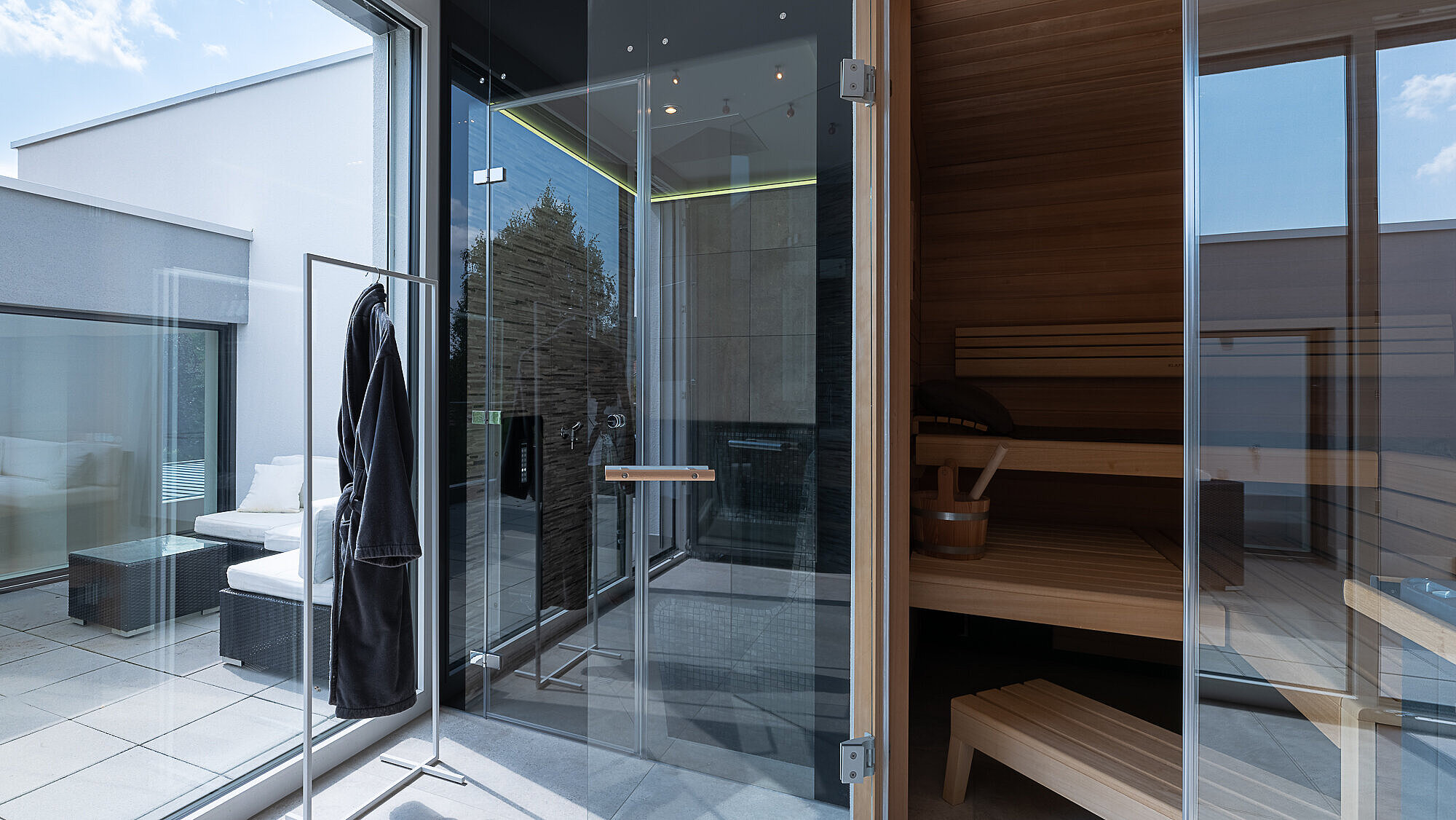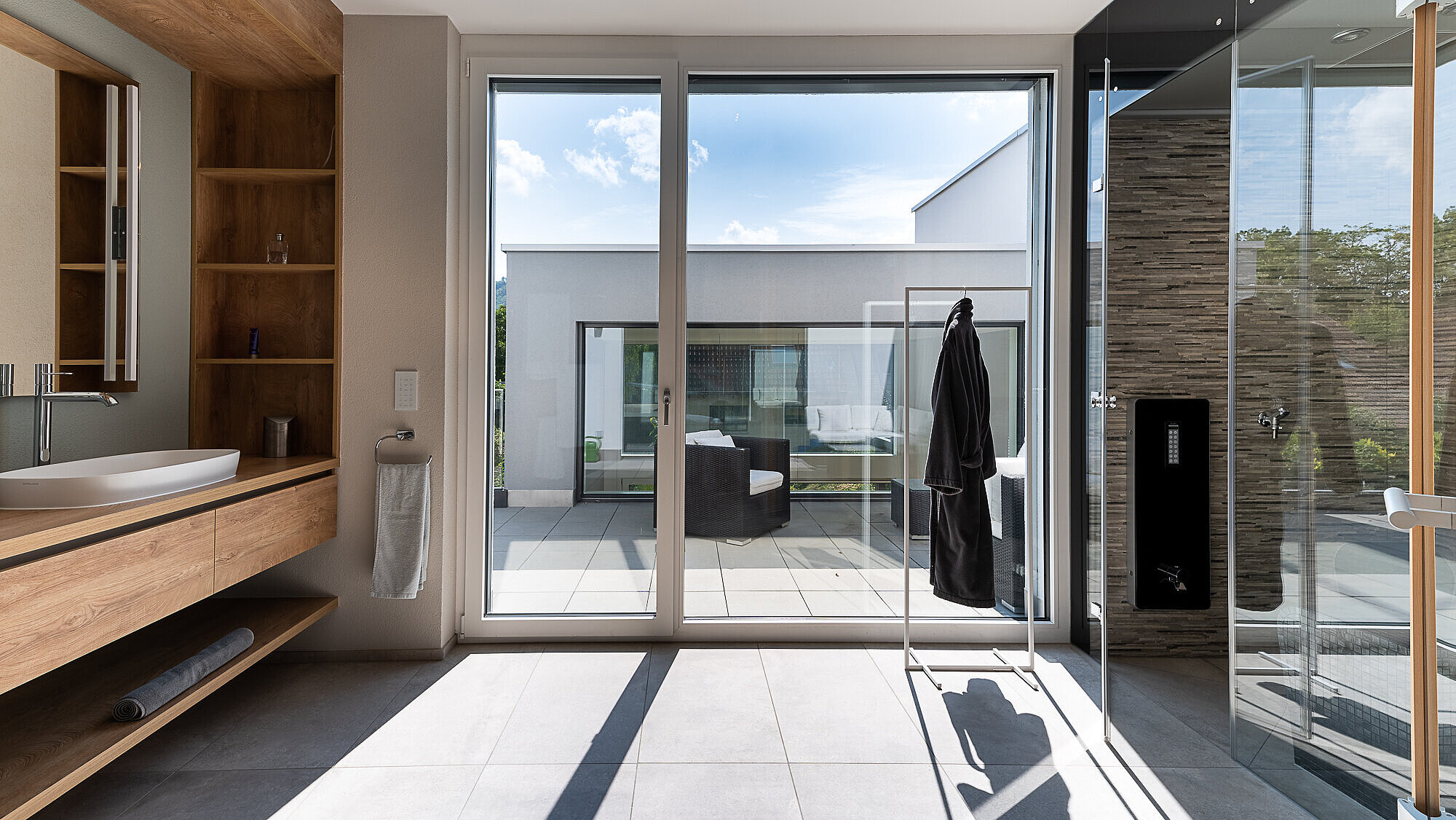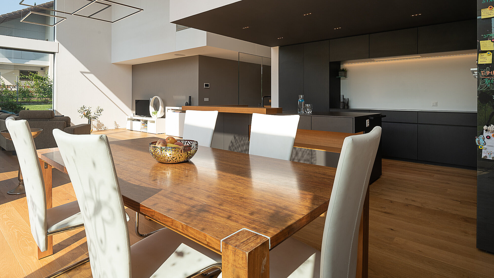 Die Küche ist unter einem Kubus, der in den Luftraum hineinragt, untergebracht. Das souveräne Spiel mit unterschiedlichen Raumhöhen und die grosszügige Inszenierung von natürlichem Licht verleihen der Architektur von TETRIS wahre stilistische Grösse. Das raffinierte Zusammenspiel aller Räume und Blickwinkel, die hochwertigen Materialien und das viele Glas machen das Architektenhaus zu einem komfortablen, repräsentativen Zuhause.