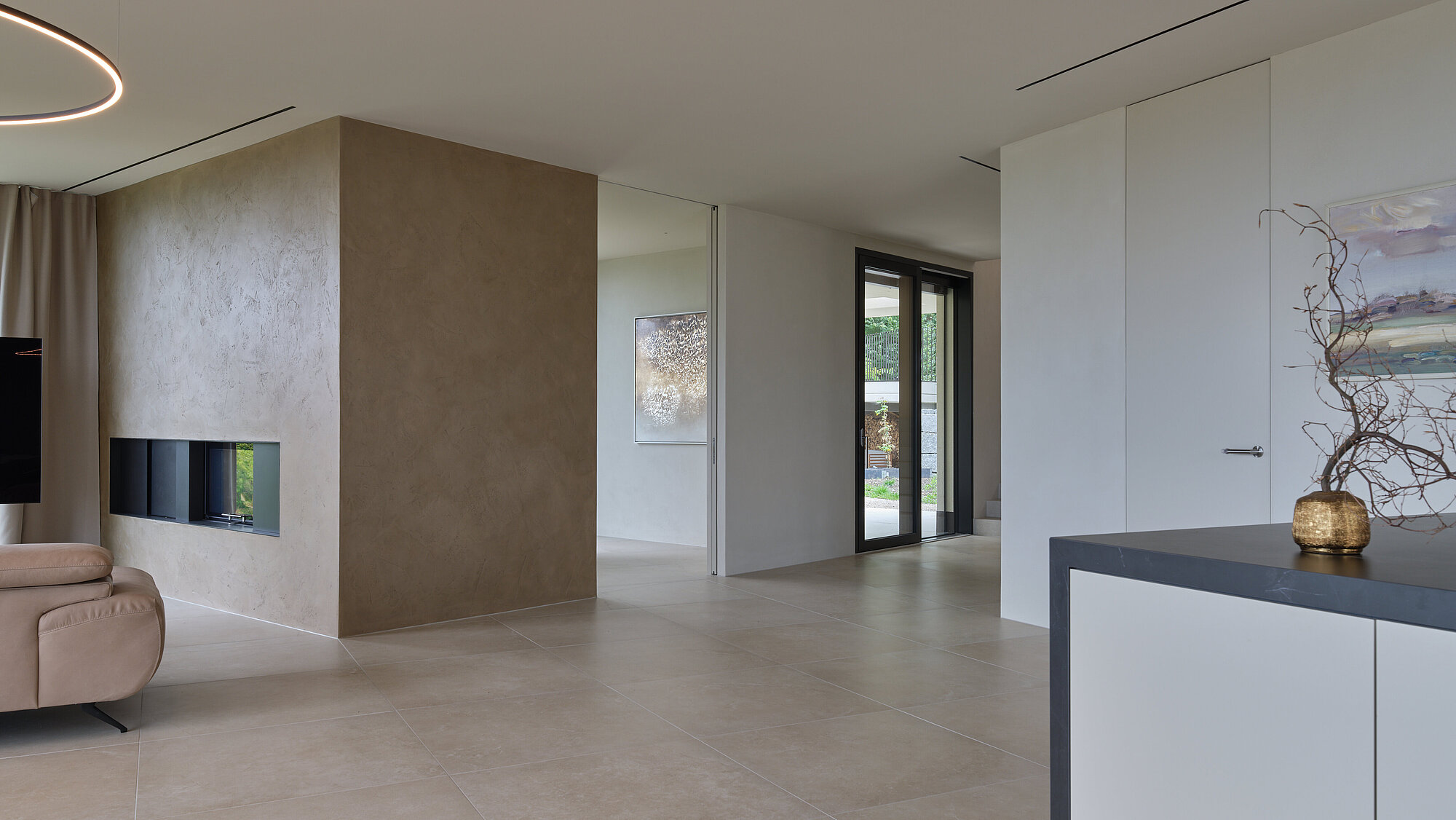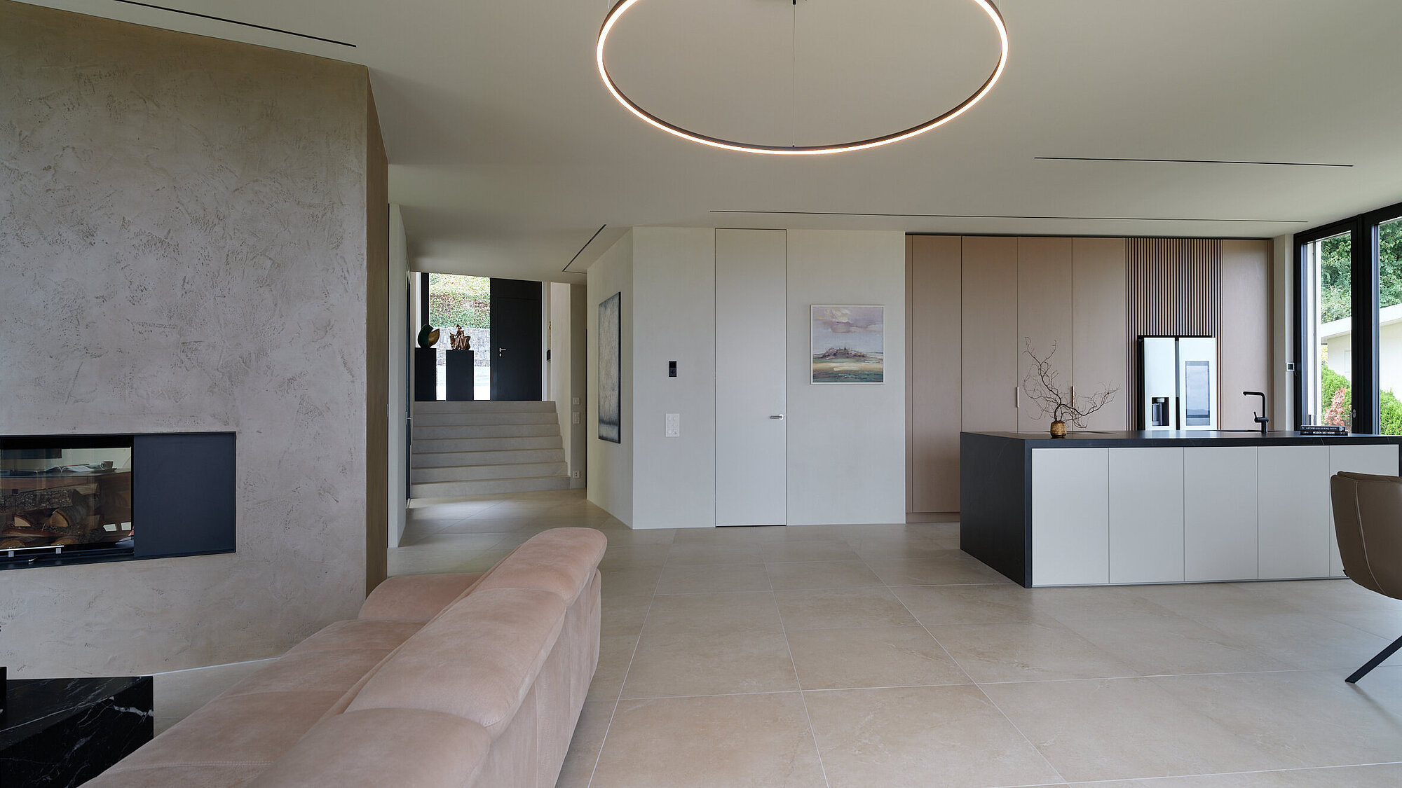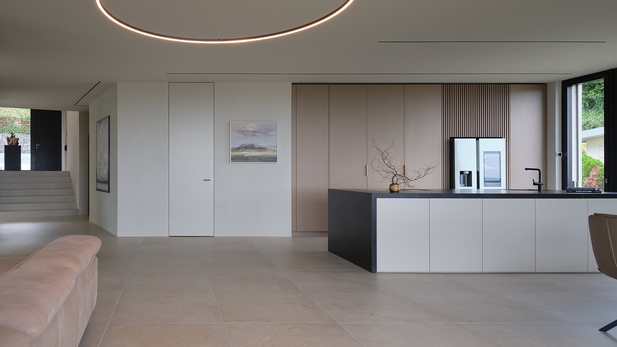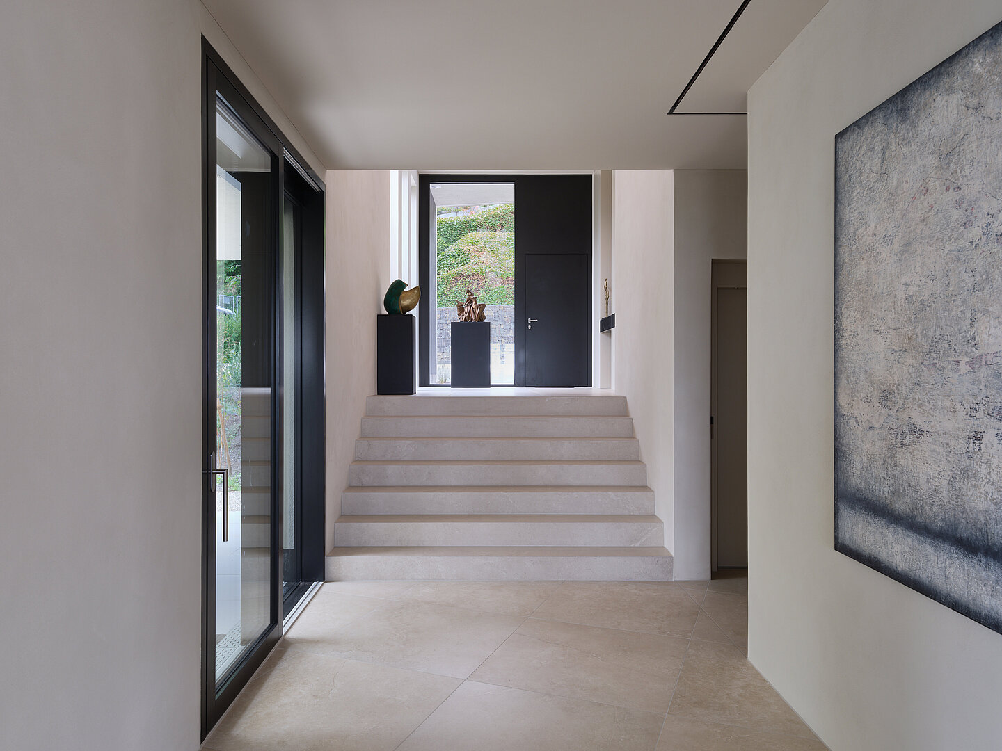 Der zweigeschossige Eingangsbereich vermittelt bereits beim Betreten ein Gefühl von Grosszügigkeit und architektonischer Klarheit. Hochwertige Oberflächen, Design-Elemente und ausgewählte Kunstobjekte unterstreichen den hochwertigen Charakter. Die Gestaltung vereint modernes Wohnen mit einer warmen, einladenden Atmosphäre.