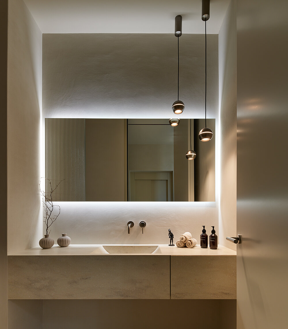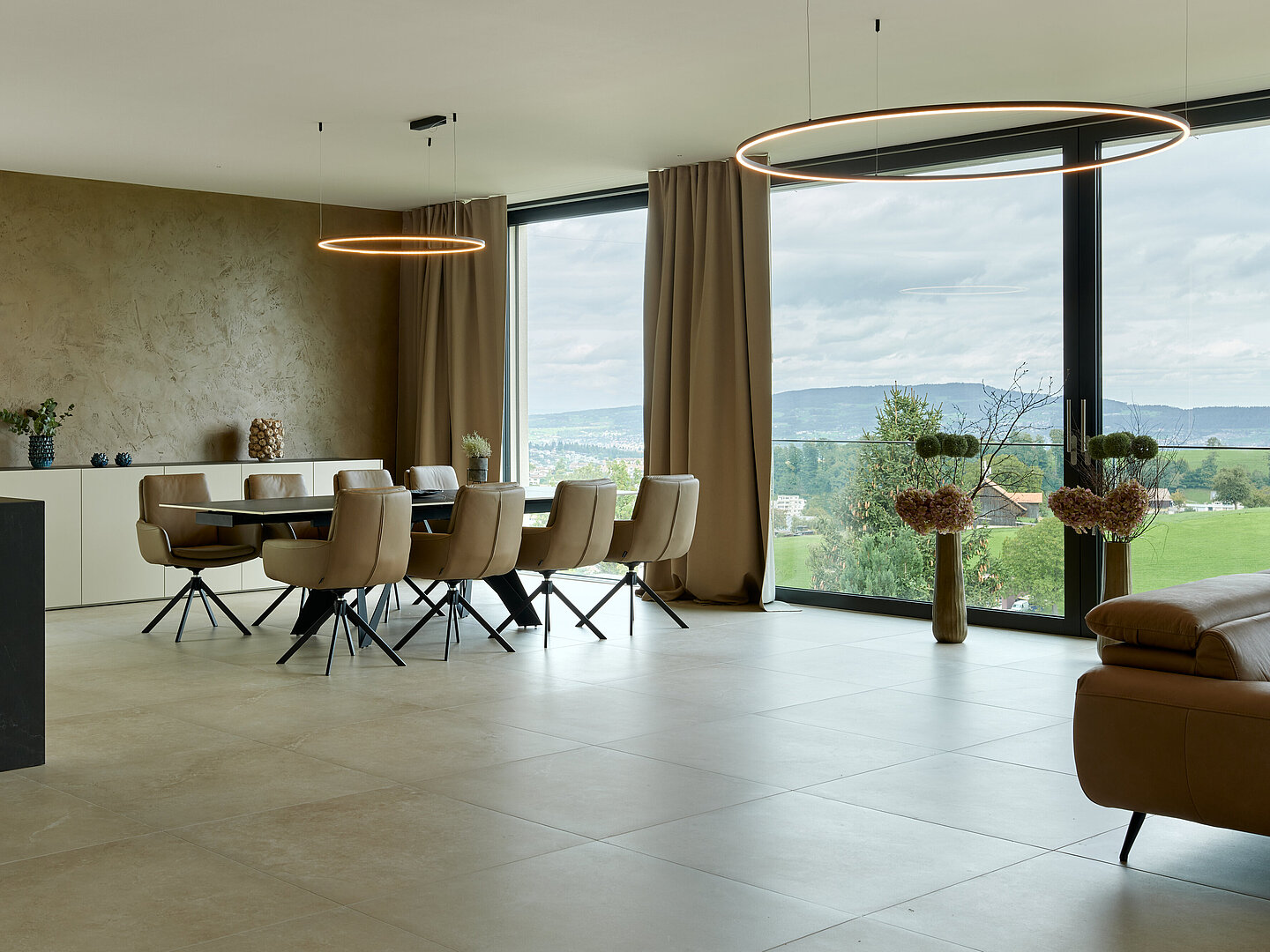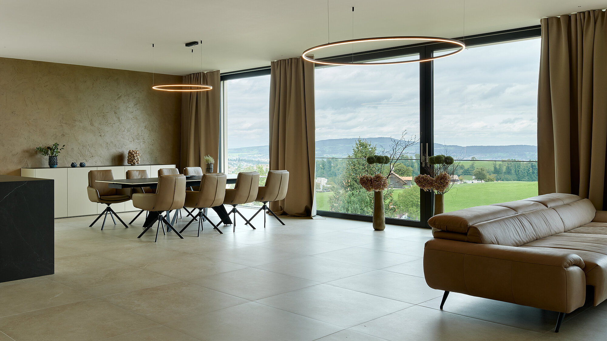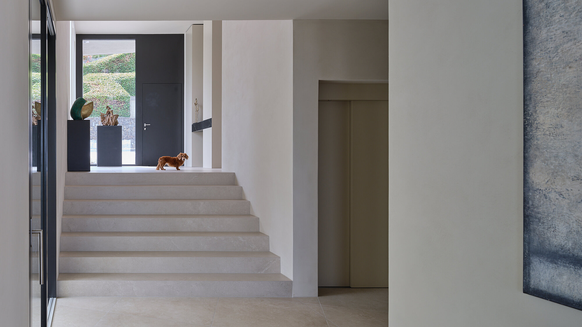 Der zweigeschossige Eingangsbereich vermittelt bereits beim Betreten ein Gefühl von Grosszügigkeit und architektonischer Klarheit. Hochwertige Oberflächen, Design-Elemente und ausgewählte Kunstobjekte unterstreichen den hochwertigen Charakter. Die Gestaltung vereint modernes Wohnen mit einer warmen, einladenden Atmosphäre.