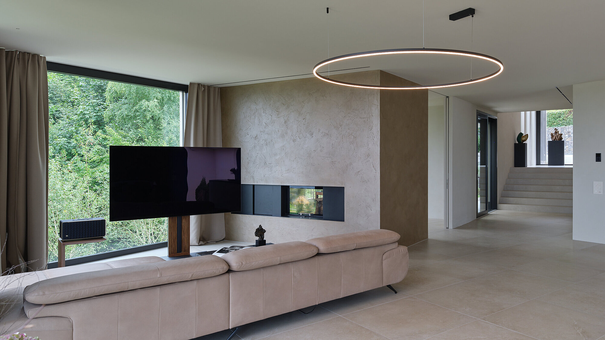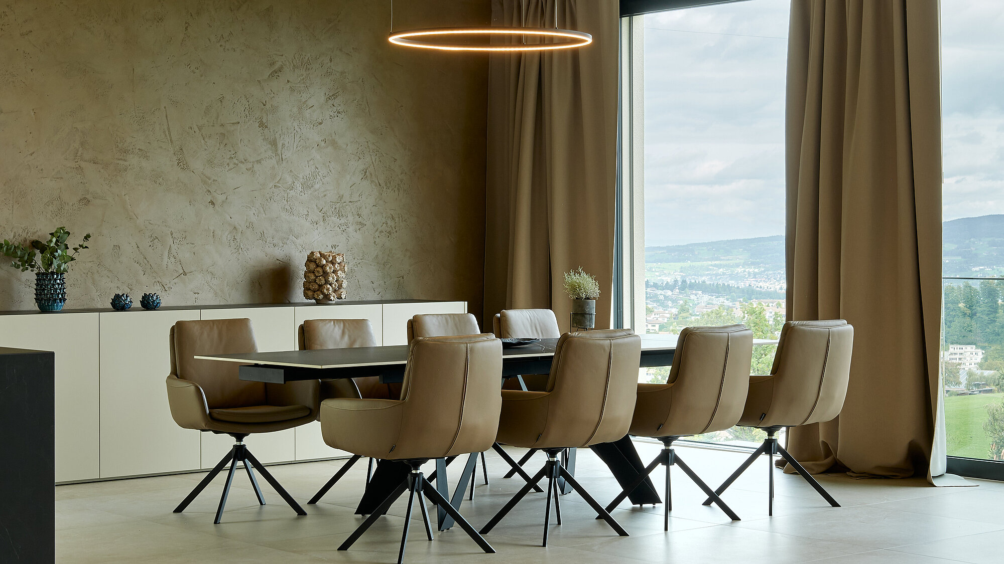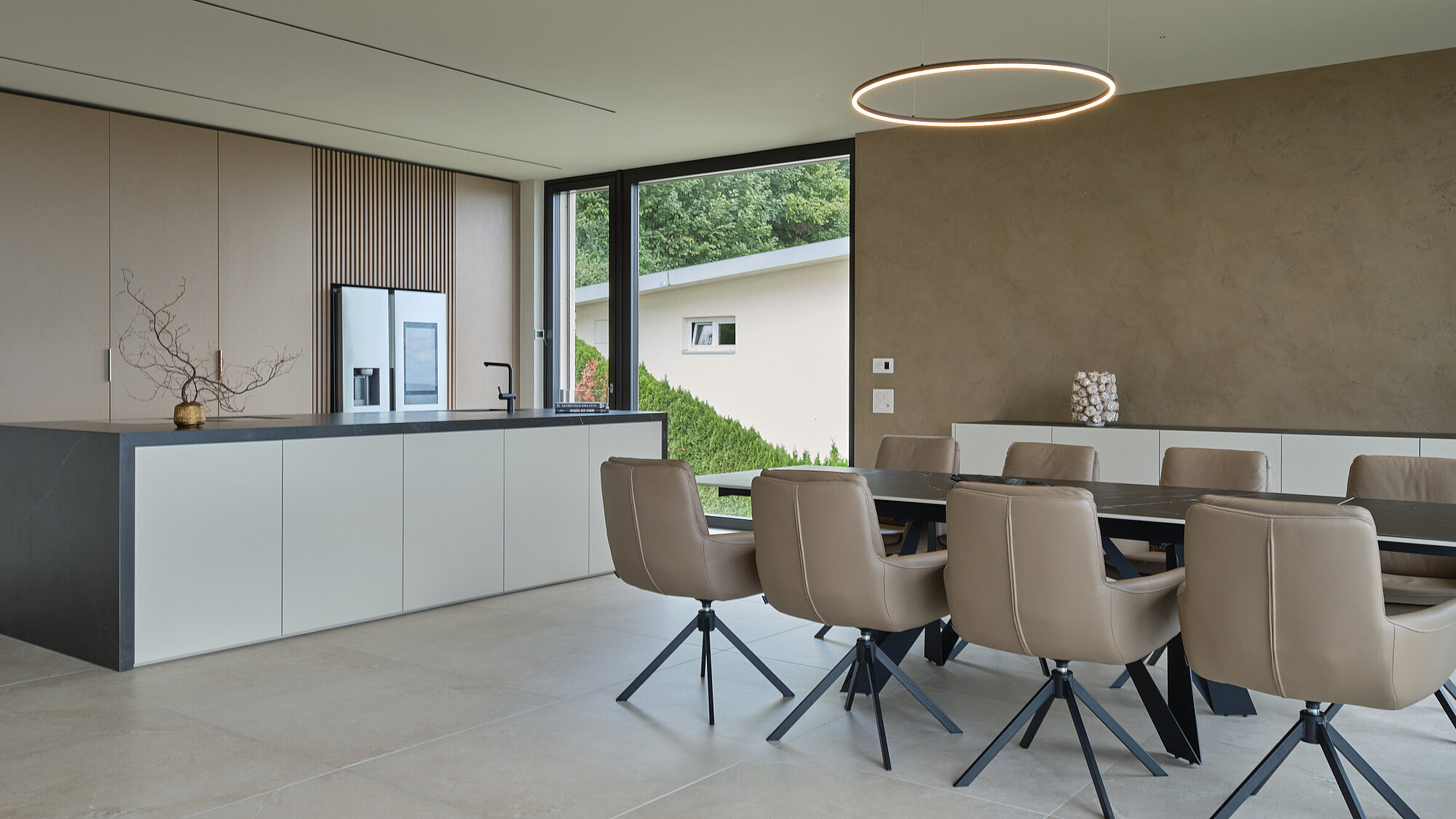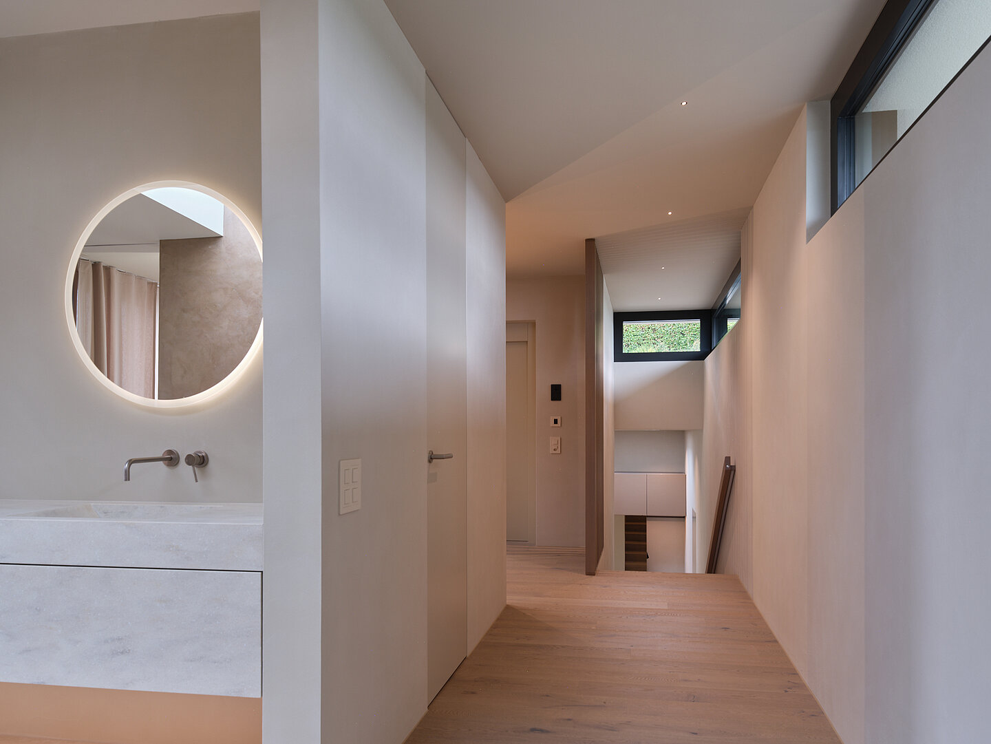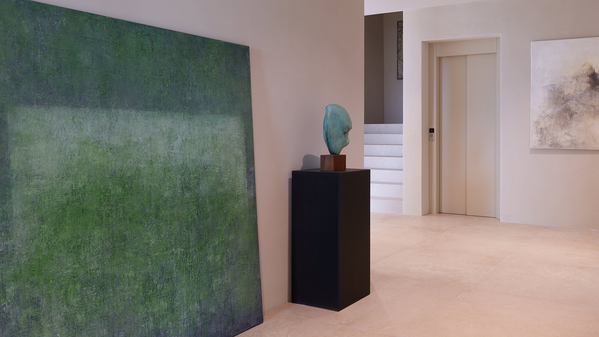 Der zweigeschossige Eingangsbereich vermittelt bereits beim Betreten ein Gefühl von Grosszügigkeit und architektonischer Klarheit. Hochwertige Oberflächen, Design-Elemente und ausgewählte Kunstobjekte unterstreichen den hochwertigen Charakter. Die Gestaltung vereint modernes Wohnen mit einer warmen, einladenden Atmosphäre.