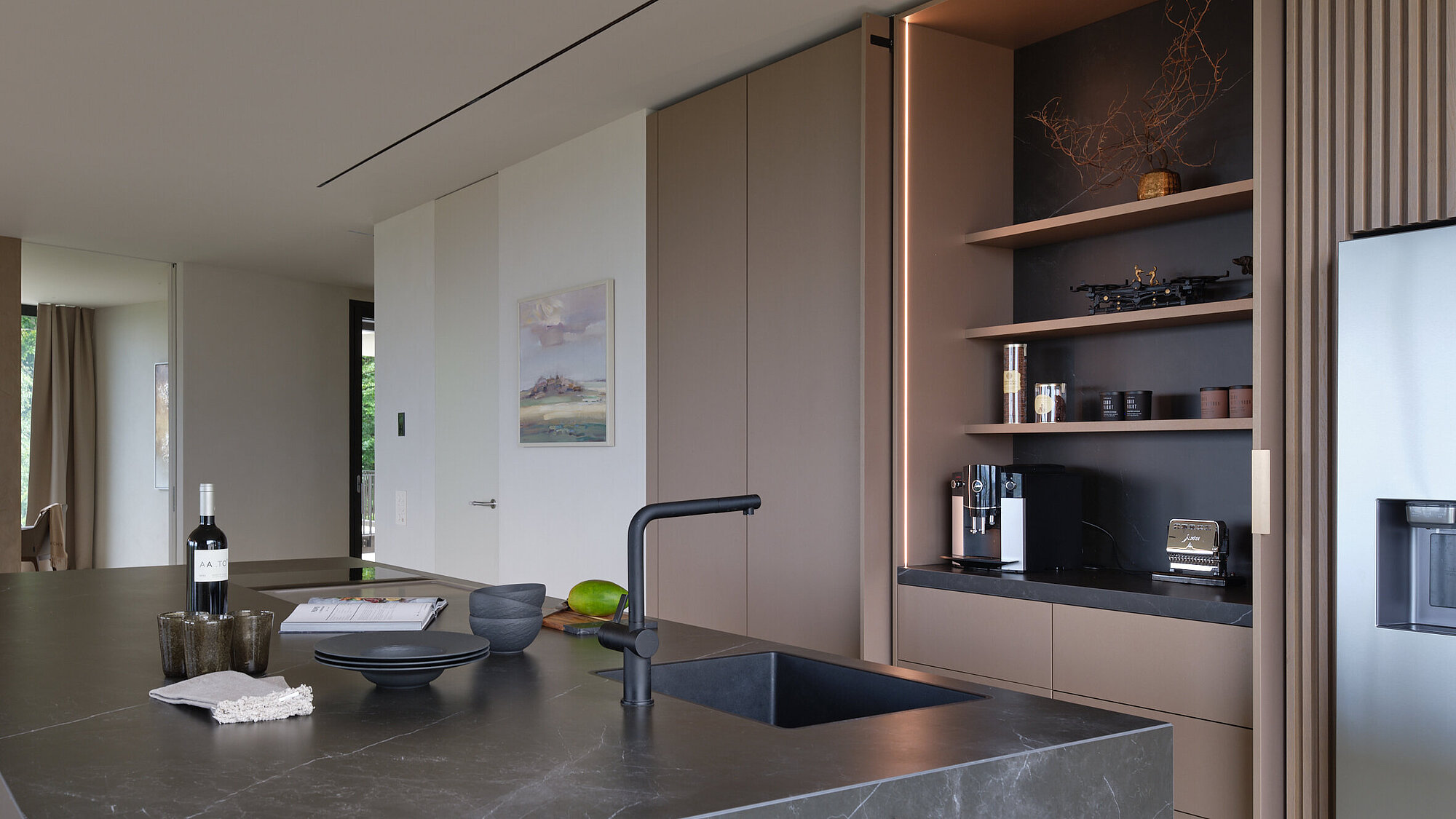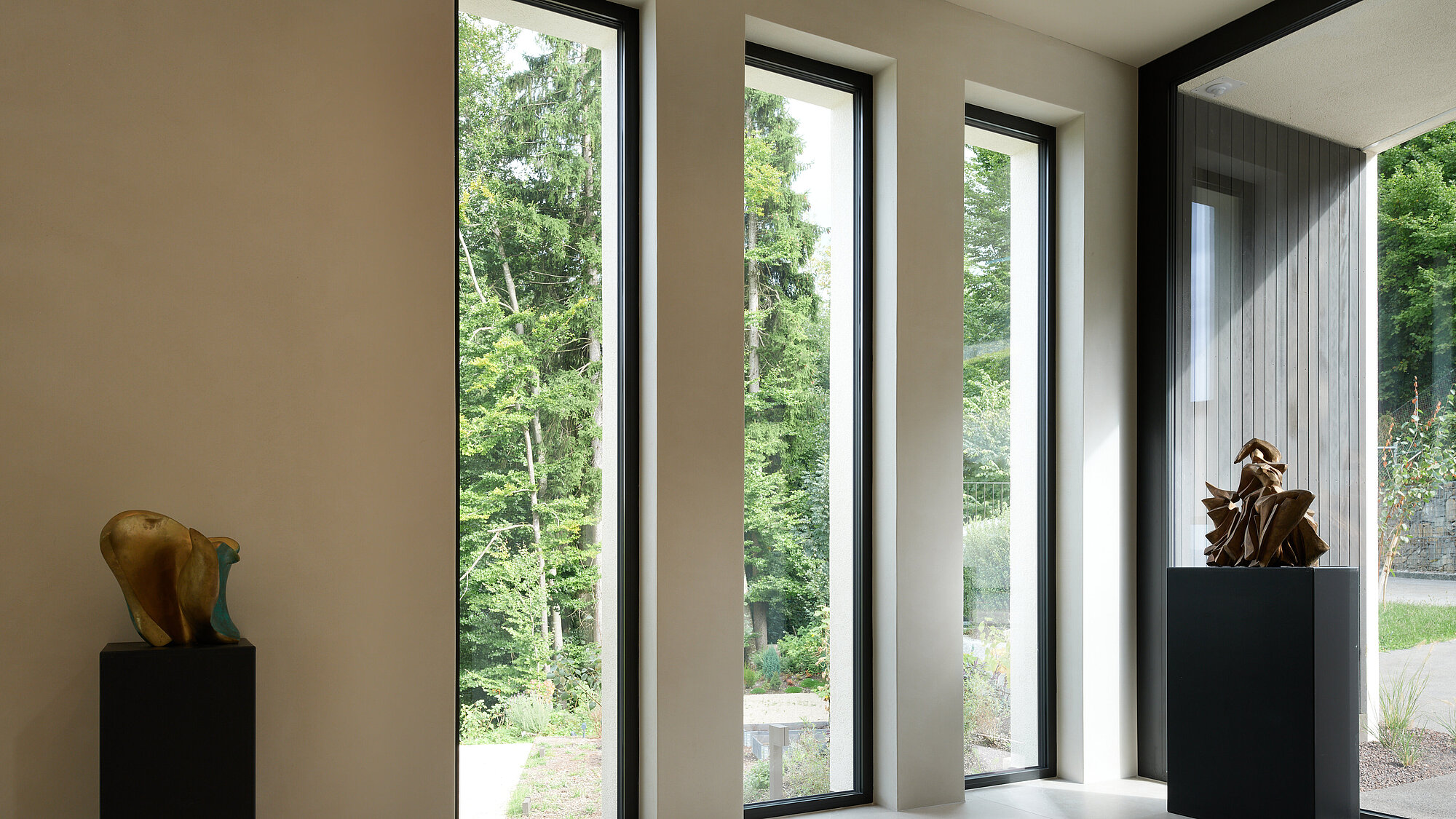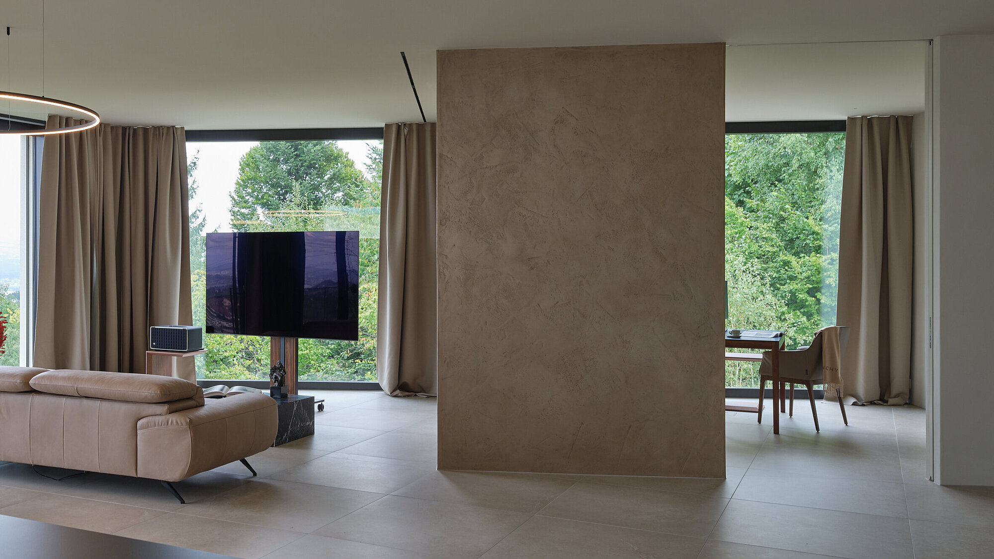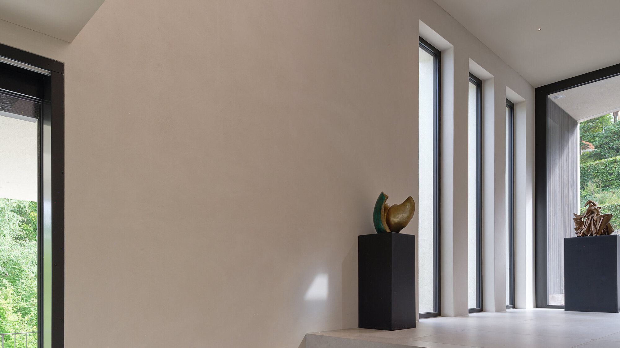 Der zweigeschossige Eingangsbereich vermittelt bereits beim Betreten ein Gefühl von Grosszügigkeit und architektonischer Klarheit. Hochwertige Oberflächen, Design-Elemente und ausgewählte Kunstobjekte unterstreichen den hochwertigen Charakter. Die Gestaltung vereint modernes Wohnen mit einer warmen, einladenden Atmosphäre.