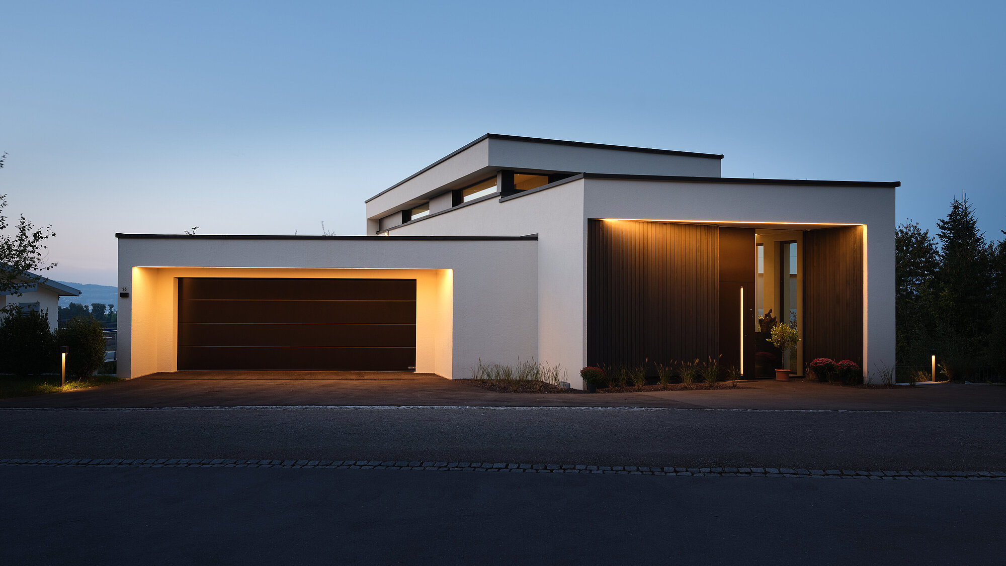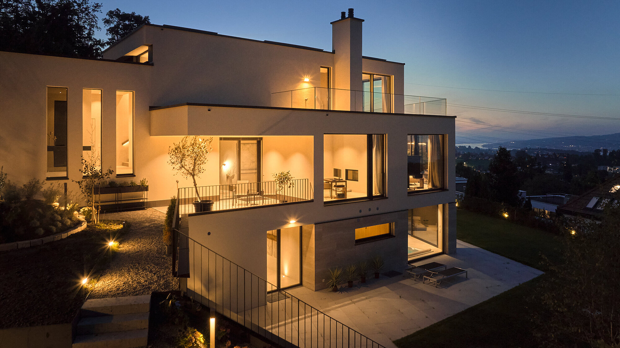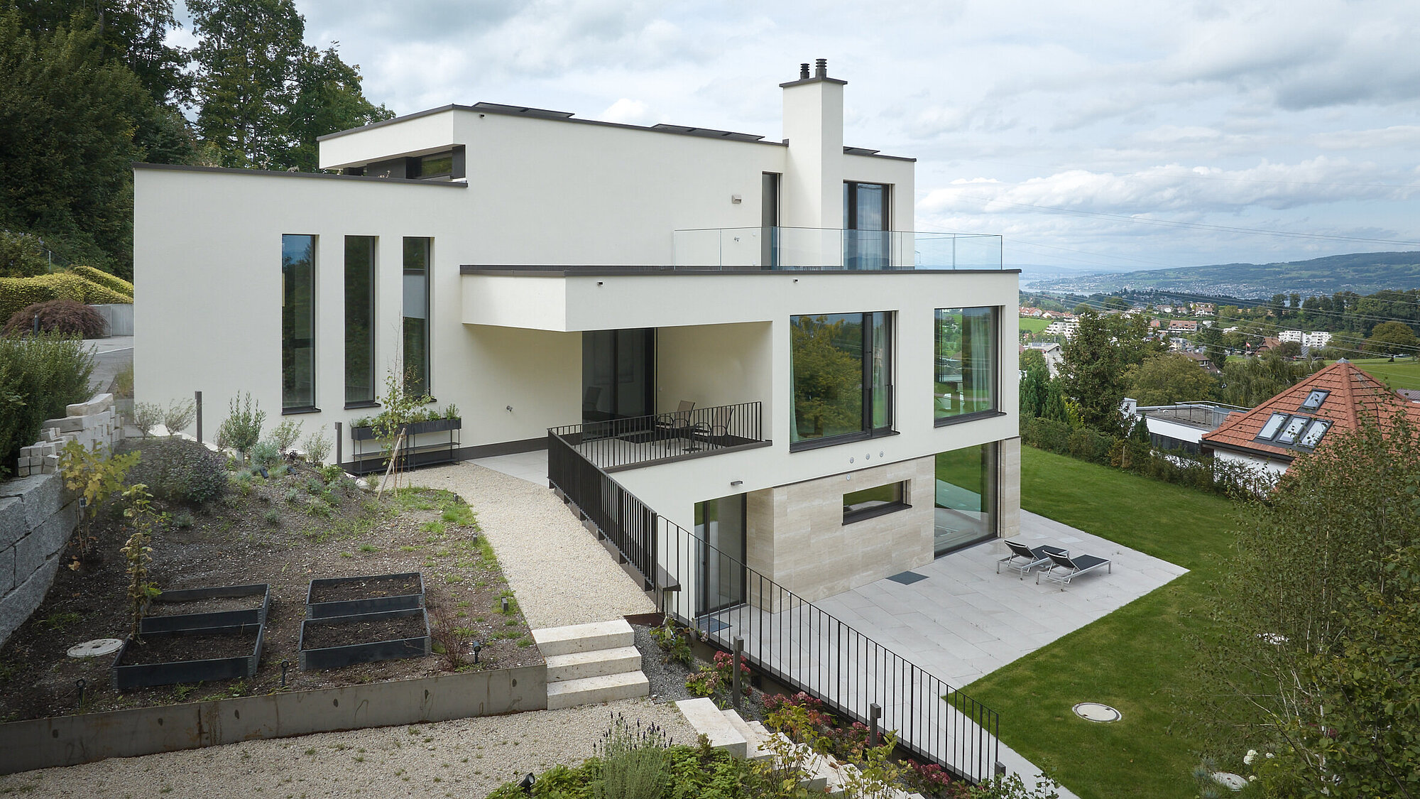 Die moderne Architektur zeichnet sich durch klar gegliederte Volumen, hochwertige Materialien und eine zurückhaltende Farbgestaltung aus. Diese Kombination verleiht der Villa zeitlose Eleganz und eine starke architektonische Identität. Grosszügige Verglasungen, Terrassen und fliessende Übergänge zwischen Innen- und Aussenraum schaffen ein hochwertiges Wohnerlebnis in direkter Verbindung mit der Natur.
