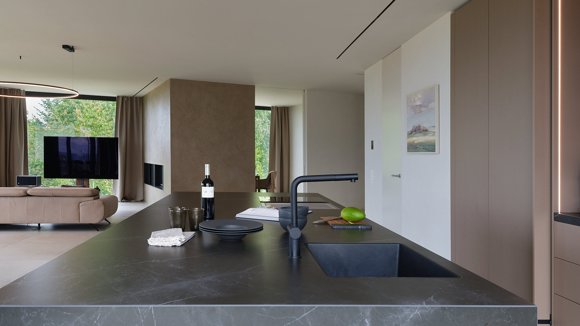 Die offen gestalteten Wohnräume mit Küche, Essbereich und Wohnzimmer befinden sich ein Halbgeschoss tiefer und bilden eine zusammenhängende Raumlandschaft. Bodentiefe Fenster eröffnen einen eindrucksvollen Blick auf den See und die umliegende Landschaft. Ein stilvolles Cheminée schafft eine behagliche Atmosphäre, während die Materialkontinuität innen und aussen das hochwertige Architekturkonzept betont.
