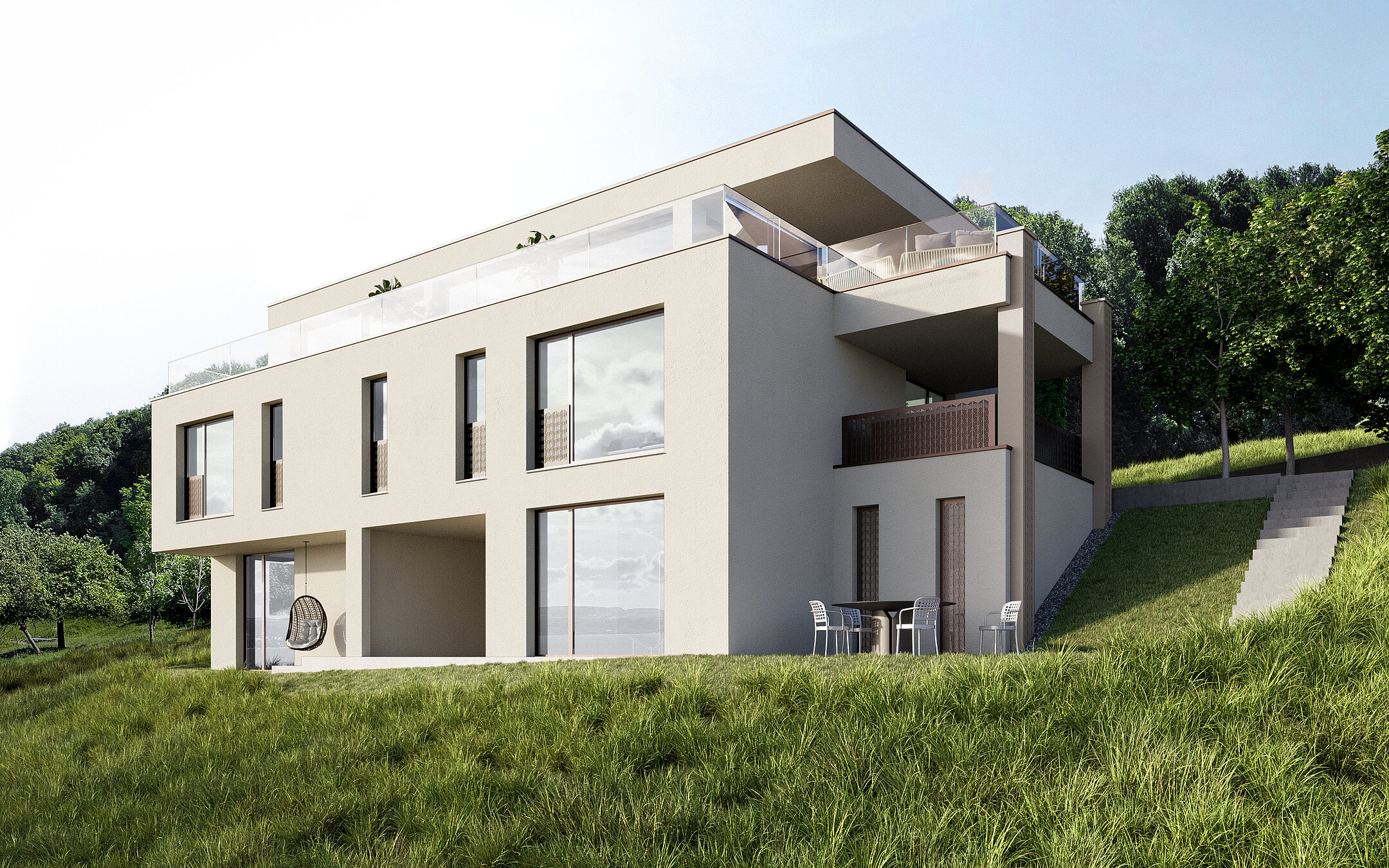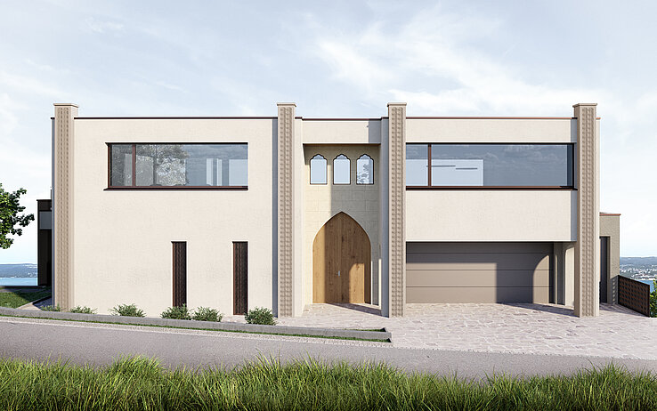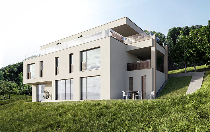 The location at the edge of the forest, with impressive views over the lake, connects living with a sense of openness and a strong relationship to the landscape. Due to the northward-sloping terrain, the building is accessed at the first upper floor. The generous entrance hall, extending over two storeys, likewise organizes the floor plan into three functional zones.