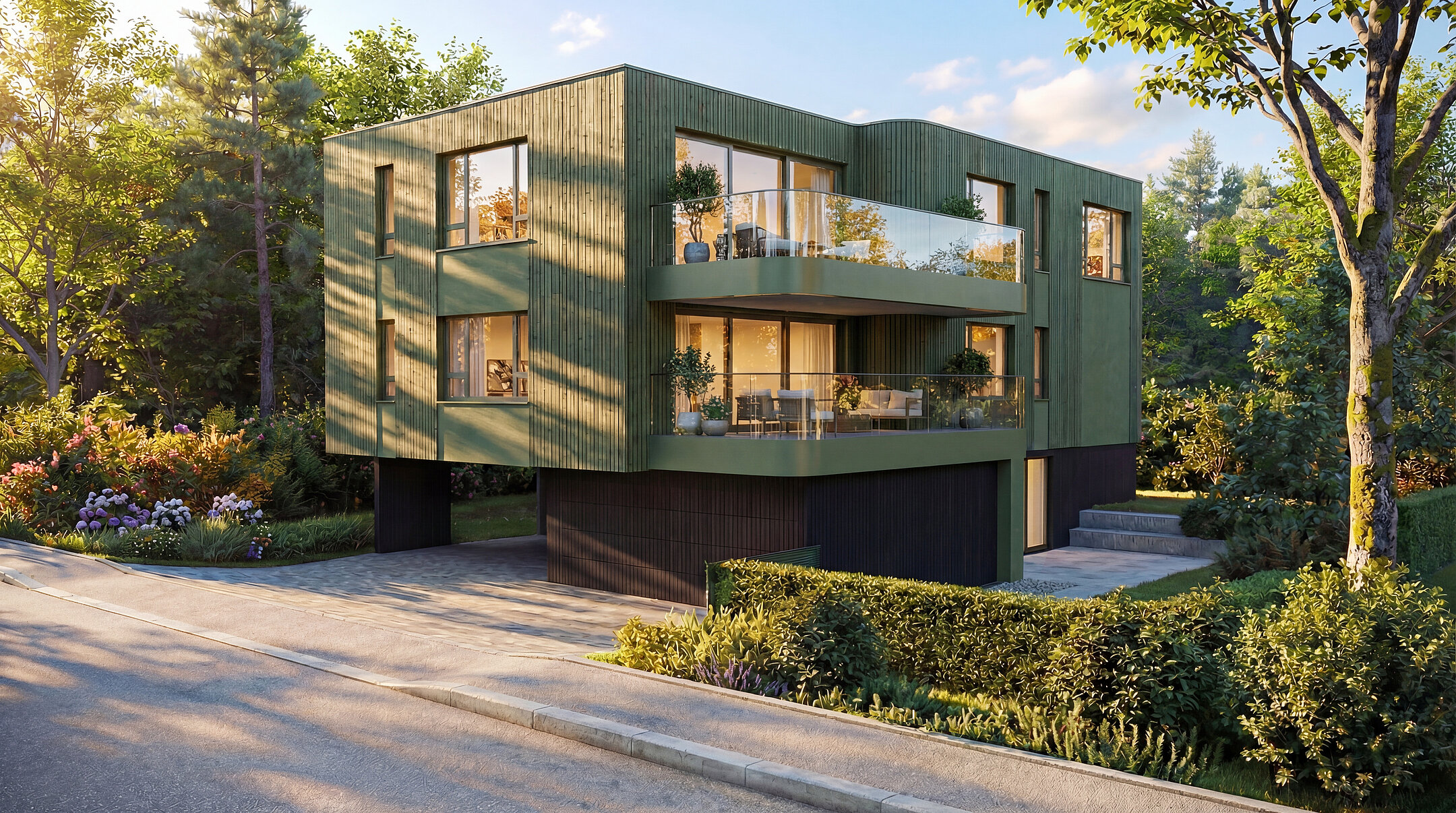 The name is inspired by the English word Emerald and reflects the vibrant green façade design as well as values such as calm, stability, and renewal. The clear cubic architectural form gives the building a quiet presence, while the vertically structured façade changes its appearance depending on light and season, adding a special architectural depth to the house.