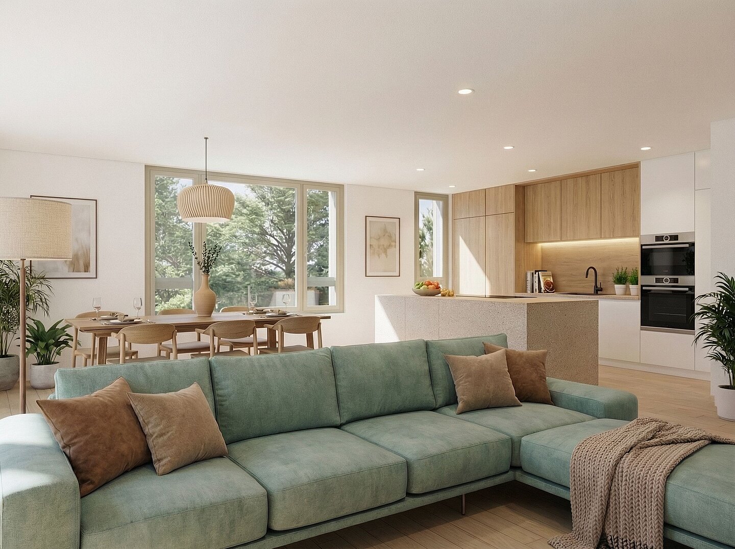 The space opens toward a shared garden available to all residents. Large glazed surfaces create seamless transitions between indoor and outdoor spaces, allowing light, greenery, and the changing seasons to become part of everyday life. In this way, a vibrant neighborhood emerges with a high quality of stay and a strong connection to nature.