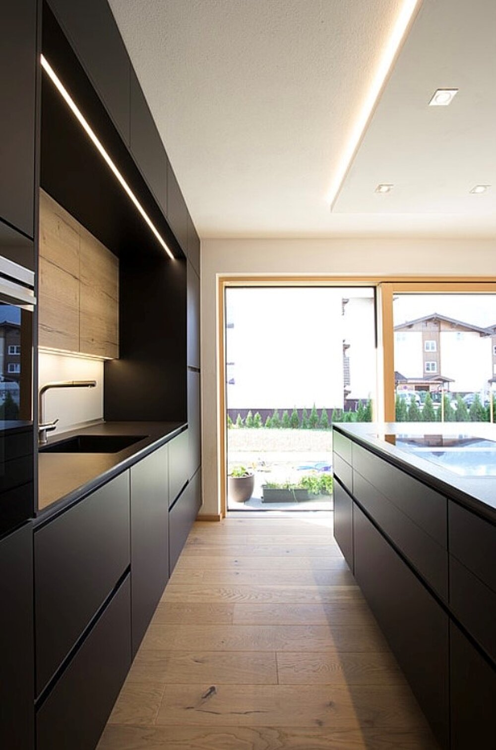 Im oberen Geschoss liegen die grosszügigen Hauptwohnräume. Der offene Wohn- und Essbereich steht für modernes Wohnen und wird durch eine elegante schwarze Küche mit Holzelementen ergänzt. Ein Luftraum über der Treppe schafft Weite und eine Lesezone. Die Terrasse mit Pergola erweitert den Wohnraum und bietet Panoramablick.
