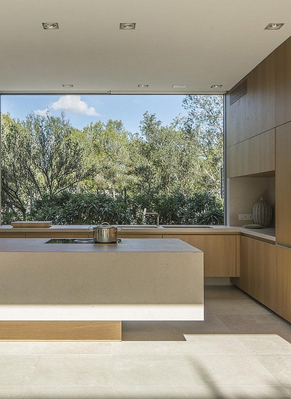 Auf Gartenniveau öffnet sich das Erdgeschoss mit einem grosszügig belichteten Wohnraum, beeindruckendem Luftraum und direkter visueller Verbindung zum See. Die grosszügige, separat angeordnete Küche orientiert sich bewusst ruhig zum oberen Garten mit terrassiertem Pool und schafft einen fliessenden Übergang zwischen Innen- und Aussenraum. Das gesamte Bauvolumen von 2'314m3 unterstreicht dabei die architektonische Präsenz und Grosszügigkeit des Hauses.