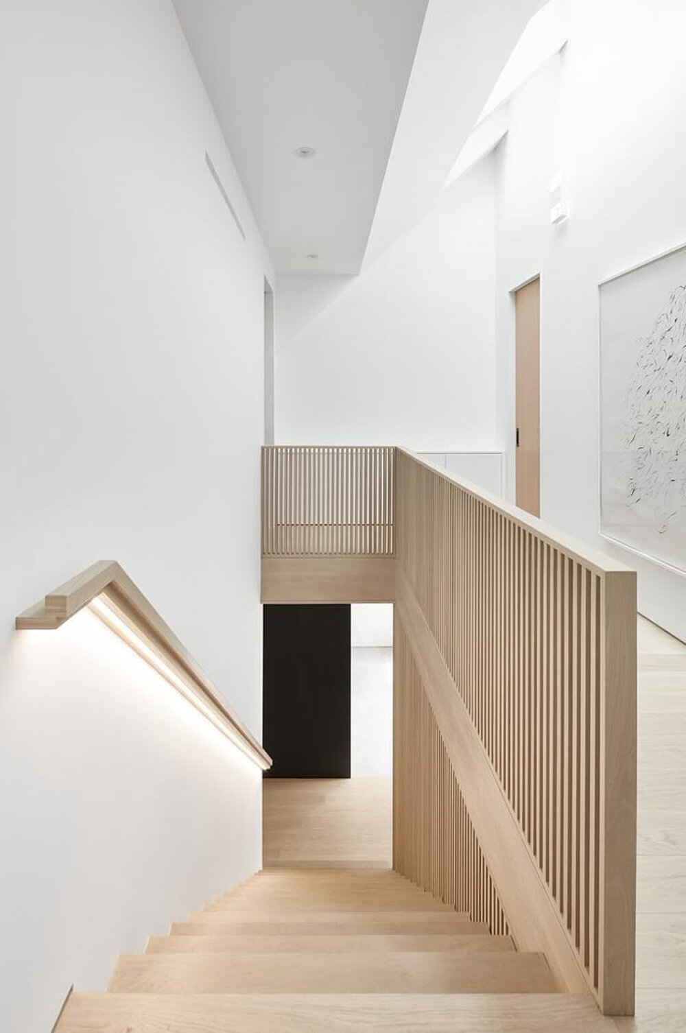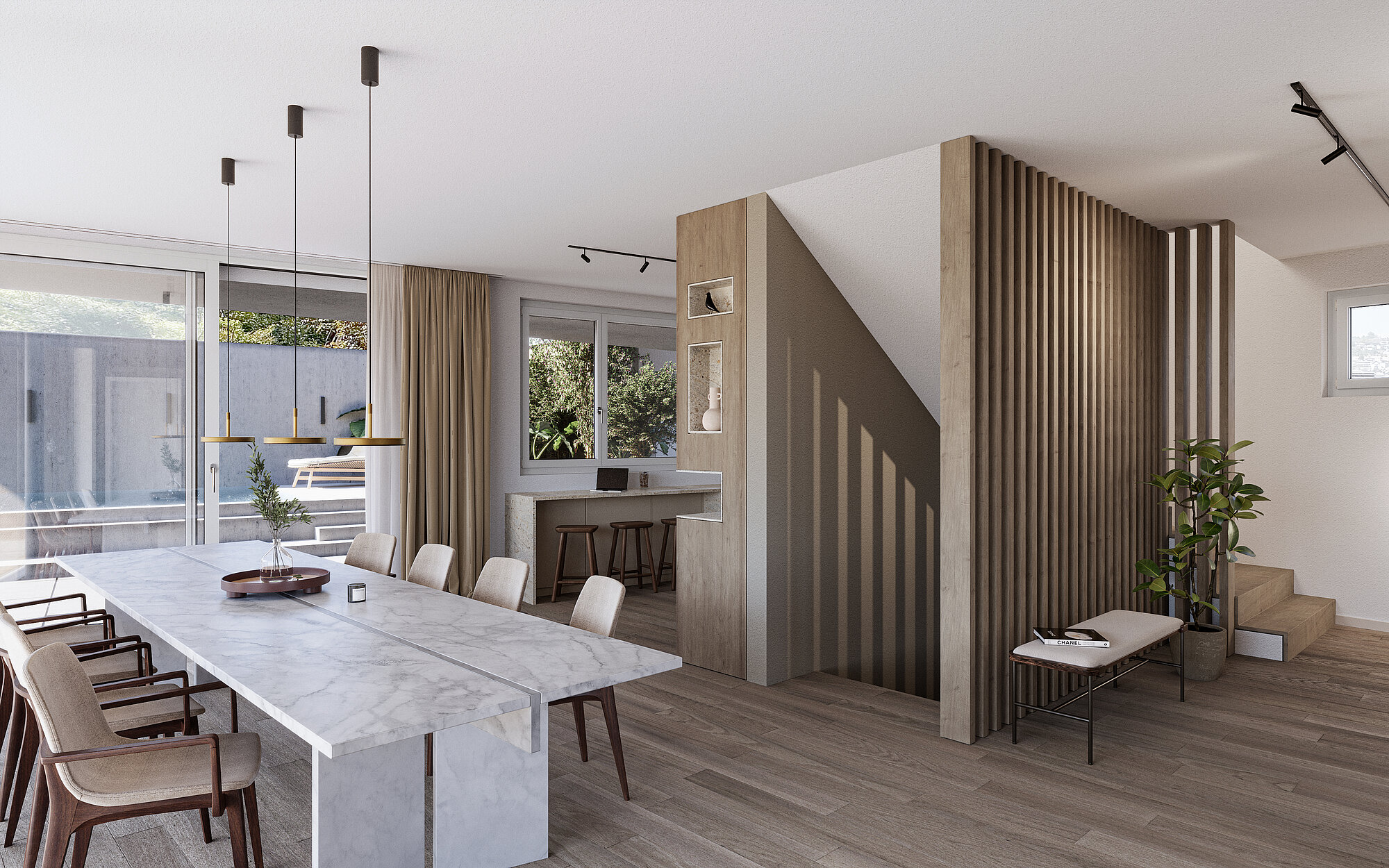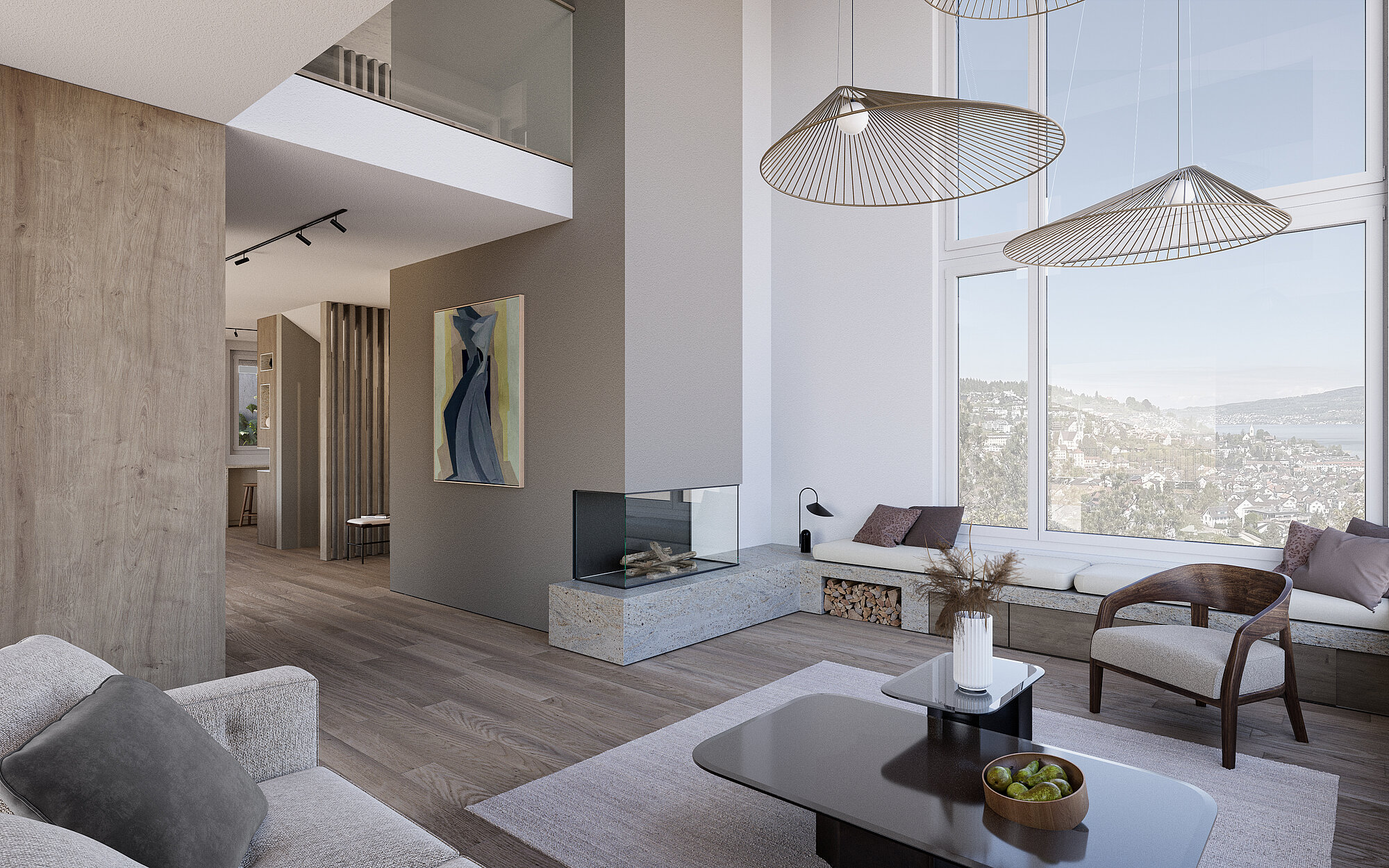 Eine skulptural gestaltete Treppe verbindet die Ebenen vertikal und wird durch einen praktischen Lift ergänzt, der höchsten Wohnkomfort garantiert. Im obersten Geschoss befinden sich die privaten Schlafzimmer sowie ein grosszügiges Büro mit Panoramaverglasung, das über dem Luftraum schwebt und eindrucksvolle Ausblicke bietet.